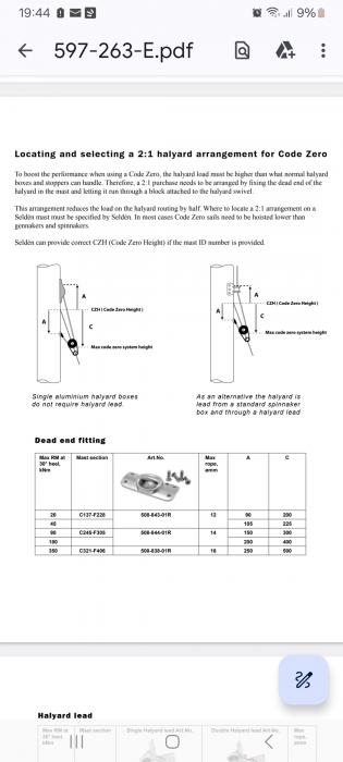 RE: Drizza 2:1 per code-0 su armo in testa d'albero - jacques-2 - 07-11-2024 @kavokcinque Help per leggere la . RM at 30° heel, kNm...? A e C espressi in mm? Le sezioni albero, grosso modo, a che misure corrispondono? RE: Drizza 2:1 per code-0 su armo in testa d'albero - cmv88 - 07-11-2024 Se non riesci a reperire l'RM30 direttamente dal cantiere, sempre sul sito della Selden troverai un calcolatore per calcolare l'RM30 (indice di raddrizzamento a 30 gradi) sulla base di alcune misure e dati che puoi facilmente misurare in barca, così almeno da avere un idea del suo possibile valore. Secondo me se postassi anche le foto del bompresso con relativi frulloni armati , potrebbe giovare alla discussione e forse anche al tuo portafoglio ;-) RE: Drizza 2:1 per code-0 su armo in testa d'albero - kavokcinque - 07-11-2024 Ti scrivo dal pc in quanto la questione è un po' lunga. Premetto che la mia esperienza e' solo sulla mia barca, un Bavaria Cruiser 40 del 2008 equipaggiato con rig della Selden. Albero 7/8 con una sola dirizza spi appena sopra l'attacco dello strallo. Per montare un avvolgitore per code avevo bisogno di distanziare correttamente la nuova drizza. Il primo passo e' stato stampare il file "Locating and selecting a 2:1 halyard arrangement for Code Zero" che si trova sulle pagine web della Selden. Poi ho chiesto tramite importatore Selden, Velamania, il piano del rig della mia barca. Mi hanno fornito il disegno con tutte le misure. nel mio caso il profilo C245 (sezione 245x127 mm) è lungo 15650 mm e l' Heeling test RM risulta 49,5 kNm @ 30° (questa misura è importante per calcolare tante cose, compreso il dimensionamento e lo sbalzo del bompresso anche se i bompressi Selden sono validi solo per gennaker. Per il code ho montato delfiniera controventata) Successivamente ho fatto chiedere a Selden una quota in mm dalla base albero alla quale poter montare la ferramente necessaria. Risposta : Top per spinnaker e gennaker; Max Code zero halyard heigt 15310 mm ( 2:1 purchase halyard required). Nota che questa CZH non è una quota alla quale fissare un qualcosa all' albero ma (vedi il disegno a sinistra) il punto in cui la proiezione del cavo antitorsione incontra la faccia anteriore dell'albero. A questo punto, dato che l'RM della mia barca e' 49,5 kNm a 30°, ho scelto dead end fitting valido da 45 a 90 kNm e la misura A di 150mm e quella C di 300. Con queste misure ho fatto posizionare al rigger scatola di drizza e dead end fitting. Solo per ultimo ho ottenuto la Max code zero system heigt che è la misura teorica per il velaio per confezionare vela e cavo AT ( salvo che le misure reali le prende in barca a ferramenta installate). Spero di aver spiegato bene quello che ho fatto e che probabilmente dovresti replicare. Sarebbe bene che Sparcraft (chiedendo per scritto e ricevendo per scritto) ti fornisse il piano del rig con relativo RM a 30° e la quota CZH ( eventualmente senti anche il cantiere della barca). Mi sembra anche che ti occorra un bozzello per la 2:1 con girella adeguata. Solo quando hai tutto pronto con le misure opportune rispettate e quindi con la ragionevole coscienza di non fare danni da sforzo eccessivo, fai eventualmente correggere le vele che risultassero troppo lunghe. Almeno questo è il mio modesto parere da utente nautico. Aggiungo che su consiglio del velaio ho poi montato la drizza 1:1 sia perche un 40ft e' al limite tra la scelta di parancare o meno, sia perche abbiamo fatto un cruising code 65 cableless in lamiato che ha necessità di tensioni di drizza inferiori come minimo del 30 % rispetto ad un code con cavo AT. Per far si di rispettare il CZH che mi avevano indicato ho fatto passare la drizza per un anello ad alto carico legato corto alle dead end fitting in modo da abbassare la rislutante del tiro della balumine della vela rispetto alla puleggia della scatola di drizza. RE: Drizza 2:1 per code-0 su armo in testa d'albero - _Mino_ - 07-11-2024 Jacques-2, prova a guardare il manuale del proprietario della tua barca; potresti trovare le info di cui si parla. RE: Drizza 2:1 per code-0 su armo in testa d'albero - jacques-2 - 08-11-2024 @Kavok: grazie, tu hai fatto un lavoro preordinato, io invece ho trovato una situazione preesistente, che peraltro ha funzionato bene per due stagioni e . Sparcraft è molto criptica e poco disponibile, peraltro mi hanno subito anticipato che "questo albero non è progettato per vele armate in testa; sappiamo che molti le mettono, ma è loro responsabilità". Per inciso, ma è una mia deficienza che nel caso potete appianare, non capisco il nesso tra kNm, RM a 30°, sezione e distanza della dead end dalla puleggia, nè ho capito cosa sia il . del Code0 sarebbe al di sopra del . ignoranza. Manuale proprietario muto su dati del genere. Foto del bompresso: facile, non c'è. Un facilone potrebbe pensare che il problema sia solo la vicinanza della dead end alla puleggia di uscita, che rende quasi paralleli i due spezzoni di drizza, e che pertanto per risolvere ogni problema basti abbassare un pò l'attacco della dead-end. Di quanto? Forse di quanto "a occhio" porti i due spezzoni ad una certa distanza tra loro... Tutto il resto? L'albero non viene giù e non si snerva perchè il Code0 lo tolgo quando vedo 12-13 di apparente (e la barca già cammina benissimo col fiocco), con il genny A1 il tiro è più da poppa quindi ancora più difficile vedere quei numeri... [hide] RE: Drizza 2:1 per code-0 su armo in testa d'albero - kavokcinque - 08-11-2024 Per il CZH basta che guardi il disegno Selden. Se Sparcraft è criptica, forse Chiedere al Cantiere del Pardo? Per farla facile io metterei i guidadrizza dove ora hai il ferro della 2:1 e metterei un dead end fitting a filo profilo 300 mm più sotto dei guidadrizza. Con questi accorgimenti dovresti evitare scarrucolamenti e attorcigliamenti. Questo ipotizzando che l'RM della tua barca sia tra 45 e 90 kNm. Per quanto riguarda la resistenza dell'albero, nel mio caso hanno autorizzato un al