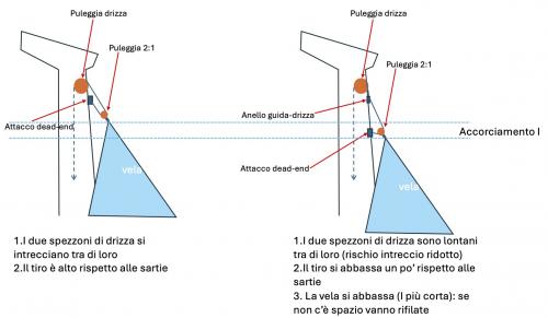 RE: Drizza 2:1 per code-0 su armo in testa d'albero - jacques-2 - 08-11-2024 Concordo con le tue considerazioni, molto di buon senso. Avevo già affrontato il problema dell'altezza dell'uscita del tiro, interpellando Sparcraft, e la questione (al di là e prima degli attorcigliamenti) mi lasciava alquanto perplesso, però ho "tirato a campare" per non perdere il Code0 ricevuto in dotazione (almeno finché non sarà da cambiare), e il Genny A1 avvolgibile che (improvvidamente) mi sono fatto fare. Se si riuscisse a rifilare le due vele in modo da accordarsi ai nuovi punti di uscita/dead-end prenderei due piccioni con una fava (che a questo punto potrebbe essere il mio ruolo...). Aspettiamo Albert, se ne ha voglia, intanto ho trovato questa tabellina che riporta qualche dato sulla falsariga della tabellina Selden che hai . può essere "raccordata" ai dati Selden per individuare quanto salire sopra le sartie... [hide] RE: Drizza 2:1 per code-0 su armo in testa d'albero - albert - 08-11-2024 Con i dati in nostro possesso non potrei essere più chiaro e preciso di quanto lo è già stato kavokcinque. In queste cose il buonsenso, soprattutto nell'utilizzo della vela entro i ranges prestabiliti, è forse più importante dei calcoli. Dato che Selden e Sparcraft non possono essere sicuri su questo punto, si mantengono sempre molto prudenziali. Ribadisco come kavokcinque il concetto del guidadrizza doppio posizionato dove ora hai l'attacco del morto, e l'attacco di questo una trentina di centimetri almeno, più in basso. Comunque guardando il tuo frullino largamente sottodimensionato per un 40', sono quasi certo che la prima cosa che esploderà sarà la sua swivel (che sopporta più carico del tamburo) e non l'albero. Per quanto riguarda l'accorciare le vele, puoi verificare se l'operazione costa di più o di meno che spostare l'attacco del frullino su una delfiniera; così come è messo mi sembra a stretto contatto con l'avvolgifiocco. RE: Drizza 2:1 per code-0 su armo in testa d'albero - kavokcinque - 08-11-2024 Non volevo toccare un altro punto di efficacia e di costo, ma una delfiniera sarebbe anche utile per esporre meglio le vele al lasco e per il code per spostare più a prua il centro di spinta della vela . Poi avresti meno problemi quando salpi l'ancora. Per le delfiniere guarda quelle di Zankipal, per i frullini Sveggen. RE: Drizza 2:1 per code-0 su armo in testa d'albero - jacques-2 - 08-11-2024 Che . per le dritte! Ora discuterò con il rigger delle vostre indicazioni, e vediamo cosa ne esce. La delfiniera vediamo, mi sembra intervento un pò invasivo, anche se ha i suoi vantaggi. Il frullino a che io sappia credo stia lì da 15 anni, è effettivamente "piccolo", ma per questi 3 anni con me il suo lavoro lo ha fatto . ho capito perchè il guida drizze deve essere doppio (immagino per prendere anche la drizza del gennaker frazionato?), dato che questa seconda drizza scende giù lungo l'albero fino al suo occhiello di rinvio o filoir come lo chiama . doppio o singolo cambia poco, ma mi chiedo perchè . buttato giù un disegnino, ditemi se ci vedete . si tratterà di prendere bene le misure e valutare l'impatto sulle due vele in termini di "I" che si accorcia... [hide] RE: Drizza 2:1 per code-0 su armo in testa d'albero - kavokcinque - 08-11-2024 Giusto quello che dici per la drizza non parancata frazionata. Il secondo disegno è concettualmente corretto ma io scenderei abbastanza con il guidadrizza e il dead end, fino ad una posizione abbastanza bassa ma che non si diano noia frullino e avvolgitore del Genoa. Sono in porto, sulla mia Imarroncinichegalleggiano.... c'è una barca come la tua. Il tratto tra attacco strallo e puleggia drizze in testa è importante, circa il doppio del mio. In più è pure rastremato. Non penso che alla Sparcraft siano degli scemi se i guidadrizze li hanno messi belli .ò chi ha scelto di utilizzare la drizza per il code così in alto a mio avviso non ha fatto il giusto. Che non sia successo niente per ora non vuol dire niente, come anche per il frullino sottodimensionato. Non penso che alla Sparcraft siano incompetenti, se stanno prudenti il motivo c'è di sicuro e magari se lo tengono... Ps il frullino sottodimensionato potrebbe pure favorire l'attorcigliamento della drizza. Secondo me devi veramente fare un reset sull'attrezzatura per questo code senza farti infuenzare da come sta ora. Per la delfiniera, se vedi, la hanno tutte le barche nuove, studiate per il code in origine. Purtroppo attrezzare il rig per una barca che non prevedeva il code in origine, costa più del code stesso. Ulteriore riflessione guardando la tua barca: senza un punto di mura più avanzato è difficile distanziare i due avvolgitori se non salendo più in alto con la drizza. Potrebbe essere la mancanza di delfiniera appunto che ha convinto il precedente armatore a salire con la drizza code così in alto. Dove muri te sei troppo vicino allo strallo di prua.Sto guardando adesso il gs 43 di fianco a prua. Eventualmente prova a fare un disegno in scala con albero completo e triangolo di prua con e senza delfiniera per capire quanto avanzare verso prua e quanto scendere con la drizza. RE: Drizza 2:1 per code-0 su armo in testa d'albero - jacques-2 - 08-11-2024 Questo week-end proverò a prendere qualche misura e foto più dettagliata, qui allego una immagine con le indicazioni descrittive. Il fermo dead-end è attaccato all'uscita drizza, motivo dell'ingarbuglio, secondo me inevitabile, e non capisco come non si sia intrecciato per un paio di anni di uso non saltuario, sia con Code0 che con .). Metto anche una foto "casereccia" dell'aspetto dei due spezzoni di drizza intrecciati che ho visto andando in testa a . finta che la confezione di chewing-gum sia il bozzello del . che puoi tirare verso il basso quanto vuoi, ma non viene giù neanche a piangere. Quindi, imperativo abbassare il fermo dead-end quel tanto da distanziare i due spezzoni di drizza. A quel punto valutare la nuova "I" risp