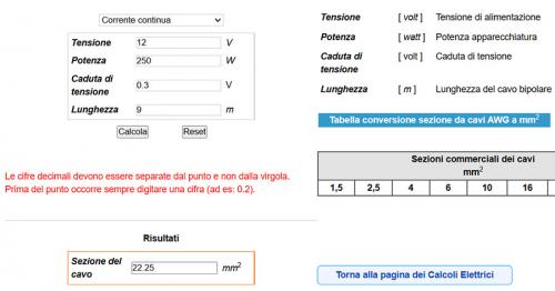 Gengis, dato che sono semplici calcoli che si usano spesso per molti altri usi, è il caso di rivedere quello che hai fatto per capire come fa a venire fuori una differenza del genere. Se hai usato il metodo della caduta di tensione passando per un calcolatore online, magari hai fatto una cosa del genere. Avrai anzitutto scritto 250W (=21A x 12V); se hai indicato 9m sulla distanza, impostando una caduta di 0.3V ottieni lo strano valore di 25mmq.