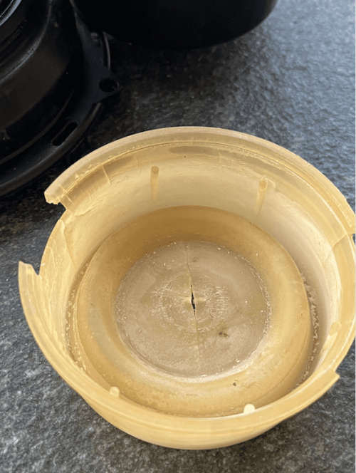 La mia ha perso tutto il liquido. L'interno ha due camere collegate da due fori , li ho chiusi eliminando la Camera con la membrana. Ho rimesso olio di vaselina lasciando una bolla per l'espansione.