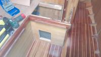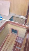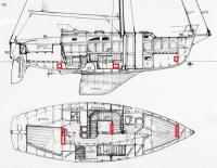 Siamo alla fase 2, ovvero il 2° impianto di riscaldamento con Webasto ad acqua (thermo Top) mod. C, analogico di recupero, prezzo circa €100, completo di tutto,perfino silenziatore aspirazione e marmitta. Barca metri 10, disegno classico in legno, larghezza metri 3, quindi non molto spaziosa come le 10 metri moderne, ma non ha divisione tra spazio sotto pozzetto ed interno, quindi il calore si disperde anche sotto il pozzetto, allego una pianta degli interni, molto simile alla mia, anche se in questo disegno pare che ci sia una divisione tra interni e sotto pozzetto. Dato che in Thermo top scalda l'acqua, bisogna inventarsi qualcosa che scaldi l'aria, ovvero degli scambiatori, ne esistono già in commercio, ma sono (a mio vedere) costosi e rumorosi. Quindi ho ordinato dei radiatori (3) da riscaldamento della fiat punto(sul web pagati meno di 50€ spediti tutti e 3). Poi ordinato ventole super silenziose da 140 mm di diametro, su cuscinetti, consumo 0,25amp (mi sembra) 12 volt, costo 17€ l'una. Quindi li ho assemblati e preparati con la sua retina resistente al calore, poi ho creato una cornice da applicare davanti al foro praticato per lo scambiatore, vedi foto.