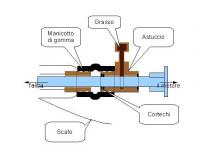 Se identico al mio, nel corpo metallico ci sono tre paraolio, due interni e uno esterno. Nel mezzo dovrebbe stare il grasso che viene aggiunto da una piccola pompetta a vite sul corpo, li dove vedo quel tubo.