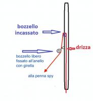 Se osservate l'allegato, la drizza (dentro l'albero) esce su un piccolo bozzello incassato, ma invece di andare direttamente alla penna, passa da un anello rivettato sull'albero (ce ne sono diversi, ad esempio più in basso lo stesso serve a mantenere il tangone che non ha la rotaia). Prima di farlo passante (ovvero saltando il passaggio nell'anello) ed eliminare così l'attrito, volevo confrontarmi con voi. Ci sono controindicazioni? C'è un motivo? L'unica che mi viene in mente è evitare che il grillo dello spi entri nell'albero per errore (ma insomma, basta fare un nodo tale da fermarlo prima...).