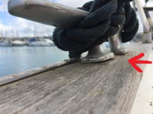 Data la loro posizione sul tek, lavorando oggi e lavorando domani, era del tutto inevitabile che il legno prima o poi subisse una compressione in corrispondenza ai piccoli piedini della bitta agevolandone poi l'eccessiva flessione dei bulloni di tenuta tanto più che su questa barca non ci sono neanche mai state le classiche bocche di rancio le quali, riportando la cima più verso prua, la avrebbero allineata sulla bitta stessa in modo di farla lavorare a trazione longitudinale e non trasversale.