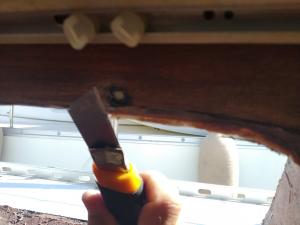 Applicazione stucco epossidico (CFS 1010 + Microfiller Power + polvere di legno di mogano per dare colore all'impasto) - vista da esterno e da interno