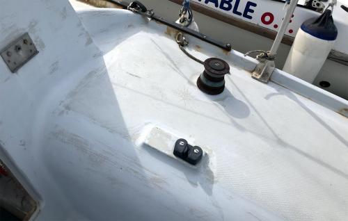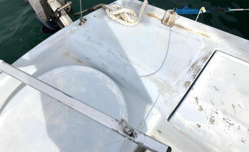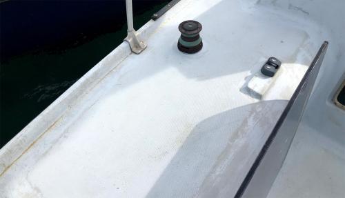 1. Levigatura (levigatrice orbitale) di tutta la coperta per togliere vernice celeste in eccesso e ritornare al gelcoat. Togliere tutta la texture antiscivolo (ci sono delle imperfezioni e zampe di gallina che se riparate creerebbero delle zone senza texture).