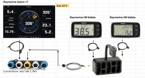 Credo i due cavi Seatalk i40 vadano connessi con opportuno adattatore (quale?) con il cavo Seatalk che arriva dal pilota poi per Axiom?