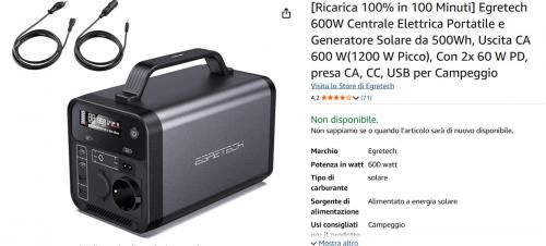 ![]() ![]() ho appena acquistato, in aggiunta ai due pannelli da 100W, un ulteriore pannello della EcoWorty da 130 W. L'idea è quella di utilizzare una piccola Power station (lifepo4, comprata un anno fà) da 600W per i consumi notturni (almeno quelli del congelatore) ed usare il nuovo pannello per ricaricarla durante il giorno seguente.. [hide] In pratica la pensata è questa: quando i pannelli smettono di caricare (un'oretta prima del tramonto) stacco il congelatore dall'alimentazione della barca e lo collego alla power station. Il giorno dopo (diciamo un'ora dopo l'alba) avrò consumato gli ampere della power station a vantaggio del consumo delle batterie della barca e quindi riattacco il congelatore alle batterie servizi della barca. In base alle prove di cui al precedente mio post, in una giornata di sole pieno, senza il consumo notturno del congelatore, con i due pannelli da 100 dovrei ricaricare completamente le batterie servizi senza più alcun deficit tra ampere consumati ed ampere prodotti. Attaccherei poi direttamente il nuovo pannello da 130 w (appoggiandolo semplicemente in una zona della coperta assolata) alla power station (che è dotata di regolatore interno) e così facendo dovrei (credo) riuscire a ricaricarla per poterla poi riattaccare di nuovo al congelatore la sera. Qualcuno obbietterà che la cosa più semplice sarebbe quella di mettere il nuovo pannello da 130 vicino ai due pannelli da 100 e collegarlo alle batterie servizi della barca con un secondo regolatore che pure già avrei (MPPT Western). Ma a poppavia sullo pseudo rollbar dove stanno i pannelli da 100 non c'è lo spazio per mettere il terzo . dite è una menata? Altra soluzione: compro un secondo pannello da 130 e al posto dei due da 100 ci metto i due da 130. Immagino che i pochi ampere mancanti dovrebbero così essere coperti. Però dovrei rifare due nuovi supporti e poi che peccato eliminare due pannelli perfettamente .: