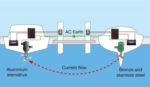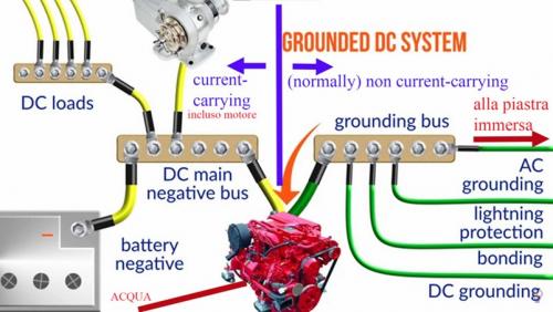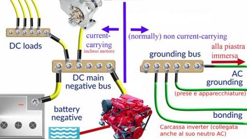 isolamento galvanico impianto 12V e terra della 220 - acquafredda - 07-01-2025 Sulla questione delle correnti galvaniche e dei collegamenti elettrici tra le masse di bordo ho letto molto, comprese teorie completamente opposte tra loro, e alla fine ho fatto una media tra quanto ho letto e quanto sapevo e la situazione oggi nella mia barca è che sono collegate elettricamente assieme: - la massa del motore - tutti i negativi comuni della batteria servizi (lifepo4) e del motore (piombo) -i serbatoi inox gasolio e acqua -l'asse del timone inox - l'asse dell'elica nell'asse dell'elica (collegato a tutto il resto) ho uno zinco sacrificale e nell'elica un altro zinco dedicato all'elica. L'impianto della corrente alternata è oggi totalmente separato, ho il cavo della colonnina che arriva al quadro dove ho un differenziale generale e poi interruttori magnetotermici che attivano caricabatterie, boiler, prese elettriche interne. Ora ho acquistato un isolatore galvanico e pensavo di collegare la terra della colonnina con questo, e da questo con la terra dell'interruttore differenziale generale. Vedo dal manuale che si consiglia di collegare alla terra del differenziale anche tutti i metalli dell'imbarcazione (e quindi necessariamente anche i negativi delle batterie). Qui il manuale dove si vede chiaramente dall'immagine quanto descritto [hide]https://www.negozioequo.com/download/Sterling%20Power/Isoltatori%20Galvanici/prosave_zincsaver_international_instructions_2006a.pdf[/hide] Nelle vostre barche la terra della 220 è collegata al negativo delle batterie? Io fino ad ora ho sempre tenuto rigorosamente tutto . sbagliavo? RE: isolamento galvanico impianto 12V e terra della 220 - rebzone - 07-01-2025 Io mi trovo più o meno nella tua situazione e da quanto avevo letto, farei esattamente quanto da te indicato, senza modificare . magari qualcuno più esperto ti saprà dire se (o perchè) apportare altre modifiche. RE: isolamento galvanico impianto 12V e terra della 220 - giulianotofani - 07-01-2025 Io sono messo così: lo Sterling sulla massa che arriva da terra col cavo della 220v Poi negativi 12 v delle batterie avviamento servizi etc tutti insieme Le masse delle 220v di bordo (gialle/verdi) tutte insieme su una massa porosa a scafo SE avete il piede saildrive che è in alluminio NON va mai collegato a niente. isolamento galvanico impianto 12V e terra della 220 - acquafredda - 07-01-2025 Non hai specificato peró se le terre della 220 oltre che sulla piastra porosa le hai collegate ai negativi 12V. Sul manuale sterling sembra proprio che vada fatto cosi RE: isolamento galvanico impianto 12V e terra della 220 - giulianotofani - 07-01-2025 Ho le masse 220v separate dai negativi 12v. Poi è ovvio che si ricircolano tra di loro sott'acqua perché i negativi sono attaccati anche al motore e dalla linea asse vanno in mare. Altri hanno tutto insieme. Comunque l'importante è metterei lo Sterling sul il cavetto di massa che arriva dalla colonnina, proprio per evitare che si formi un loop barca-mare-pontile- colonnina- barca [hide] RE: isolamento galvanico impianto 12V e terra della 220 - maema - 07-01-2025 La norma ISO 13297 dice chiaramente che in presenza di RCD/GFCI (interruttore differenziale, salvavita) tutte le masse dell'Ac 230V devono essere collegate alla massa del motore, (e quindi al negativo batterie), che con le sue appendici immerse si comporta da dispersore, questo ovviamente mette a rischio di corrosione le suddette appendici per correnti impresse da Imarroncinichegalleggiano...., (ove talvolta il loro valore in volt è più alto della barriera di 1,6V introdotta dal separatore galvanico a diodi), personalmente ho misurato oltre 10Volt in un'occasione (infatti le eliche erano sparite...). L'argomento è stato affrontato più volte e mi pare anche in dettaglio. Dal punto di vista della protezione per elettrocuzione quando è presente una sorgente Ac 230V è necessario che la barca abbia un dispersore di terra immerso, ma questo può essere realizzato con una piastra porosa immersa, invece di sfruttare le appendici metalliche in acqua, riducendo così il rischio di vedersele smangiucchiare... Altrettanto giusto osservare che nel caso del sail drive Volvo (Yanmar è diverso), il piede non può essere considerato un dispersore perchè è isolato dal blocco motore. RE: isolamento galvanico impianto 12V e terra della 220 - acquafredda - 07-01-2025 Grazie Maema. Mi scuso se l'argomento è stato affrontato piu volte.. Quindi in definitiva consigli di collegare la massa 220 con la massa 12v la quale a sua volta è collegata (nel mio caso) al motore, all'asse dell'elica e allo zinco in questo installato che dovrebbe fare da elemento sacrificale RE: isolamento galvanico impianto 12V e terra della 220 - maema - 07-01-2025 ... possibilmente suggerisco di montare una piastra porosa (sempre immersa) e separare le masse 220Vac dai negativi per evitare di utilizzare le appendici immerse come dispersori ed evitare quindi corrosioni dovute a correnti impresse dalla rete di terra di Imarroncinichegalleggiano....... Ad esempio dove c'è un generatore elettrogeno non faccio mai mettere in comune i negativi delle batterie motore/generatore, se serve fare un parallelo di emergenza per l'avviamento utilizzo un doppio contattore. RE: isolamento galvanico impianto 12V e terra della 220 - gava - 08-01-2025 io ho una domanda ma se non ho la 220 in barca allora non ho bisogno di isolamento gavlcanico no? RE: isolamento galvanico impianto 12V e terra della 220 - st00042 - 08-01-2025 Se ti riferisci all'isolamento tra SD (almeno Volvo) e motore, serve lo stesso RE: isolamento galvanico impianto 12V e terra della 220 - Gabriele - 09-01-2025 Grazie Maema, l'immagine adattata qui sotto dovrebbe somigliare alla soluzione che descrivevi. Puoi chiarire se i collegamenti ai due busbar vanno uniti dove c'e' la freccia rossa (al centro della figura)? Se ho capito bene, il tuo busbar di destra (AC e grounding, senza ritorno batterie)