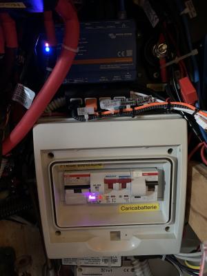 La Victronizzazione non si limita alla gestione delle batterie, ma é stata estesa anche alla alimentazione a 220V. Rispetto al sistema precedente, mai documentato, é stato aggiunto un ulteriore interruttore differenziale posto accanto alla presa industriale da 16A sotto al tavolo del pozzetto. Sono stati cambiati i cavi tra la colonnina del porto e la presa industriale e tra il nuovo salvavita ed il quadro elettrico 220V, posto in cala vele sotto il pozzetto. Nonostante avessero circa 6 anni, entrambi i cavi presentavano una ossidazione piuttosto pesante che spariva riducendo il cavo di circa 40 cm. per parte. Per questo ho deciso di sostituirli con cavo nuovo 3x2,5 mmq. con isolante in gomma. Restrizioni permettendo, provvederó a sostituire i restanti cavi che uniscono il quadro elettrico 220V alle varie prese all'interno della barchetta. Il separatore di carica precedente, uno Sterling, che andava benissimo, é stato sostituito con un Victron VDI-16 per pura pippa mentale. Ho aggiunto poi nel quadro 220V un interruttore magnetotermico WiFi da 16A che mi permette di comandare, anche da remoto con Alexa, tutte le prese 220V di bordo. Visto che l'etá avanza ed il rincoglionimento pure Smiley44, mi dimentico qualche volta di staccare il cavo dalla colonnina del porto; attraverso Alexa ho la possibilitá di rimediare staccando l'alimentazione delle prese e mettendo in stand-by il caricabatterie Victron.