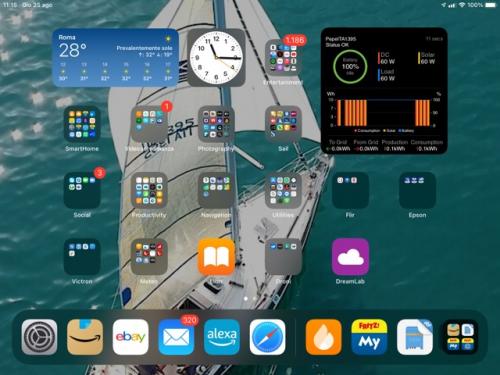Una novitá carina vista oggi sul forum degli Utenti Victron. Il costruttore olandese ha rilasciato un widget che permette di monitorare in remoto lo stato della propria installazione direttamente sulla home del vostro smartufone o del vostro tablet, questo sia per iOs sia per Android. Ovviamente la vostra barchetta deve essere connessa ad internet e munita di un device Victron GX (Cerbo, Venus, ecc.). Il widget puó essere configurato anche per occupare meno spazio sul video, fornendo peró meno informazioni. Essendo io un notorio megalomane nella foto della home del mio iPad si vede la versione piú completa.
