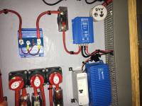 Tutto il mondo e' paese, il distributore tedesco ha dichiarato la disponibilita' del DC/DC charger, poi al momento dell'ordine ha detto che il caricabatterie sarebbe arrivato nella quindicesima settimana dell'anno, che per gli amici e' la prima di aprile.  L'olandese invece e' stato onesto e lo ha dichiarato subito. Brutte notizie quindi, e' tutto fermo, nel frattempo ho aggiornato lo schema includendo un secondo Battery Monitor BMV-712 Smart. In questa configurazione occorre "sorvegliare" in maniera puntuale anche la batteria motore per gestire con precisione le soglie di attivazione del DC/DC charger. Inoltre il battery monitor, per quanto brutto e poco leggibile, ha il vantaggio di avere una parvenza di gestore eventi. Al verificarsi di una certa condizione, ad esempio il valore massimo o minimo di temperatura o del voltaggio delle batterie, puo' attivare/disattivare un rele'. Ho intenzione di utilizzare questa funzione per staccare sulla batteria motore il caricabatterie IP43 e lo SmartSolar, su quella servizi il DC/DC charger, in caso di aumento ingiustificato della temperatura delle stesse. In questo momento sono installati sulla barchetta lo SmartSolar 75/15, un BMV-712 Smart con sensore di temperatura. Domani arriva il caricabatterie a 220V Phoenix IP43 30A (1+1). Quest'ultimo e' un caricabatterie doppio in un unico contenitore, 30A per le batterie servizi e 3A per quella motore.