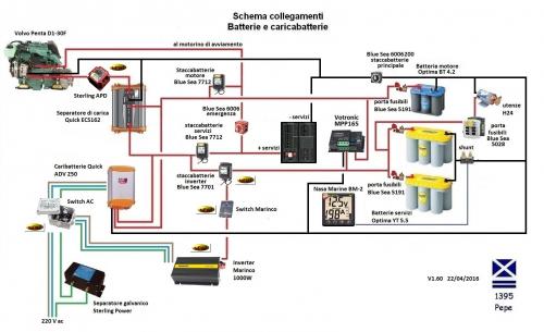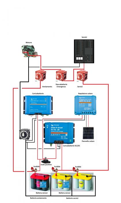 2) il caricatore DC/DC nel mio caso 12/24. occorre inserire un coltello da aprire quando lasci l'imbarcazione ferma per qualche giorno perché a mio parere, (sto ancora verificando) il caricatore DC/DC cerca di tenere le batterie che deve caricare ( nel tuo caso vedo che sono quelle dei servizi ) sempre al massimo delle loro carica, e questo lo fa prelevando energia dalla batteria del motore. Penso che quando che il pannello solare che hai inserito non sia in grado di fornire sufficiente energia per mantenere carica la batteria a cui e collegato la stessa verrebbe scaricata dal DC/DC fino ad arrivare al livello di tensione minimo. inutile dire che in queste ultime stagioni abbiamo sostituito alcune batterie dando colpa del mal funzionamento ad un loro difetto, ma a mio parere i problemi sono diversi ma il più grande è proprio la gestione del caricatore DC/DC. altra cosa se un domani una delle due batteria dei servizi dovesse funzionare male il DC/DC continuerebbe a cercare di caricarle surriscaldandole e esaurendo tutta l'energia anche della batteria da cui preleva l'energia. spero di non aver fatto troppa confusione ed essermi fatto capire ed averti dato qualche informazione utile a completare il tuo impianto