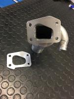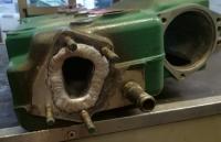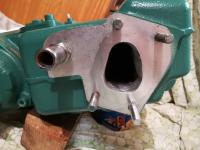 Questo permette di avere la sezione di passaggio identica a quella degli scambiatori "nuovo " tipo. Fatta anche una piastrina sacrificale in alluminio da 7 mm di spessore, medesima sezione di passaggio, che ha la funzione di rovinarsi nel tempo riducendo l'usura sullo scambiatore. ( l'ADV Orteip che la monta sun motore serie A o B ha verificato dopo un anno leggera corrosione sulla piastrina, valutando il tempo di sostituzione in circa 3 anni). Quindi scambiatore, guarnizione, piastrina, guarnizione, raiser.