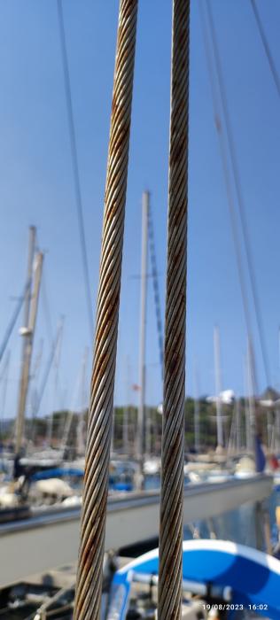 A volte Piccoletto. Sempre la storia delle sartie vecchie che sono meglio di quelle nuove: è una fesseria. Ovviamente si deve andare su acciaio certificato e rivolgersi a strutture attrezzate per non introdurre contaminazioni ferrose - basta poco per creare zone di ossido importanti. La patina di ossido che si vede nella foto di Dato, che poi è solo un'ombra un po' più rossiccia, può essere eliminato con un qualsiasi decapante. Quella patina ritornerà per un anno o due finché non si formerà la vera patina di ossido che protegge l'acciaio inox. Esistono anche dei prodotti che accelerano la passivazione, ma so che creano una patina bianchiccia (meglio pulire ogni tanto quella rossiccia). Ho cambiato le sartie nel 2019 ed hanno fatto quell'effetto per due anni, poi hanno smesso come previsto. Stessa cosa per la barca precedente (sartie cambiate nel 2015).