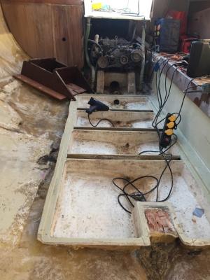 perdonate l'ordine non cronologico come si può vedere nelle foto ho fatto dei buchi nelle traverse (non ricordo il nome) nel pavimento pensando che fossero piene e strutturali vista l'eta della barca, invece ho scoperto che erano vuote e fin qui nessun problema, se non fosse che erano tutte pieno di acqua (o qualcosa di luquido) che stava li da anni. quindi ho deciso di fare fori passati in ogni traversa per mettere un tubo nei pochi cm della traversa per renderle tutte comunicanti e poter cosi mettere una pompa di sentina. già che sono aperte rinforzero tutte le traverse rendendole strutturali. magari non serve a di sicuro non gli fa male.