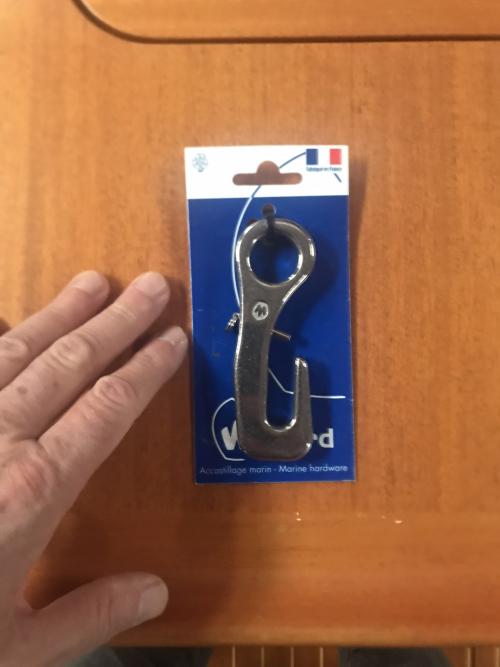 I ganci oltre a poter cedere Piccoletto e indeboliscono la catena. Quest'anno passerò ad una cima di dyneema , una specie di loop, fissata alla catena al quale collegare le due cime per le bitte.
