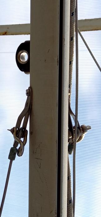 C'è un perno passante da una parte all'altra dell'albero con due piastre dove si attaccano le sartie.