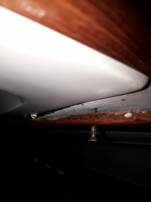 Come da foto ho un ingresso d'acqua sottocoperta che sfoga sul bordo esterno dell'obló (vedi foto, in cui si vede anche che ho svitato la cornicetta per confermare che la via d'acqua - si vede anche una gocciolina - proverrebbe dalla base dell'albero che è a poppavia rispetto all'obló).