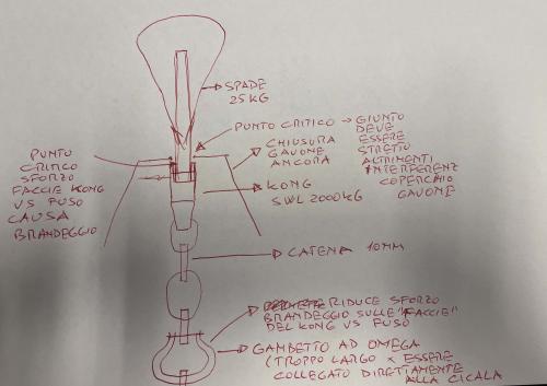 3) ma così facendo il gambetto va in interferenza con la chiusura del gavone Soluzione? Cicala-Giunto girevole Kong (bello stretto)-qualche maglia di catena-gambetto ad omega (per ridurre sforzo causa brandeggio tra giunto Kong e fuso)