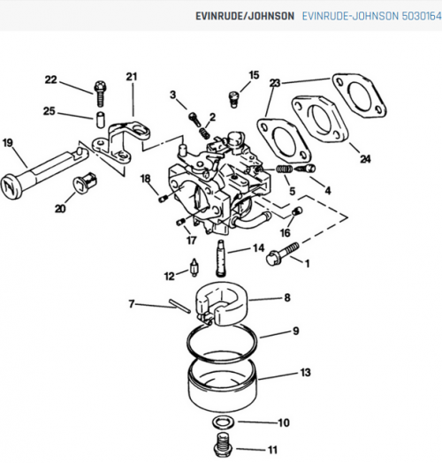 Avevo un Johnson 6Cv 2T con un problema simile se non lo stesso. Motore fermato per un paio di stagioni, forse . di un gommoncino da pesca e poi è diventato per qualche tempo il motore della mia prima barca cabinata a vela, il Tucano. Comunque vado per rimetterlo in moto ma niente, dopo parecchia insistenza parte ma si rispegne dopo pochi borbottii. Ci sono diventato belin per giorni fino a quando in un forum trovo le indicazioni che speravo e il "maledetto" riparte senza problemi. La causa era lo spillo della valvola di regolazione della carburazione dei bassi, un pernetto a punta lungo una decina di cm in "ottone?" che si era usurato e non lavorava più a dovere. Io non so se il 5cv ha il pomello come nel 6cv ma se così fosse, magari è la soluzione. Allego il link alla pagina del manuale dove si vede il pomello di cui parlo; è il particolare n°19 [hide] .[/hide] e il componente di ricambio acquistato: [hide] .[/hide]