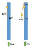 sul bozzello volante agisce una forza di 100 N verso il basso, che è il carico della vela. su entrambi i rami della drizza agiscono 50 N sempre verso il basso, che vanno in puleggia e in punto fisso d'attacco (potete immaginare il punto fisso come una seconda puleggia in cui la drizza entra e viene bloccata. cosa cambia?). Quindi a parte splittare il carico su 2 punti, sono nella medesima situazione di prima, l'albero deve reagire con 200 N per rimanere fermo.