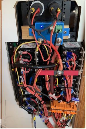 , ed ho montato lo smart Battery Protect all'interno del quadro elettrico. Nelle foto si possono vedere il quadro fronte e retro, lo SBP e' lo scatolo azzurro che e' stato inserito tra il cavo di alimentazione del pannello e la barra dei positivi del quadro.
