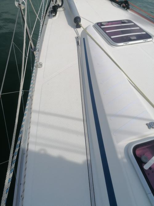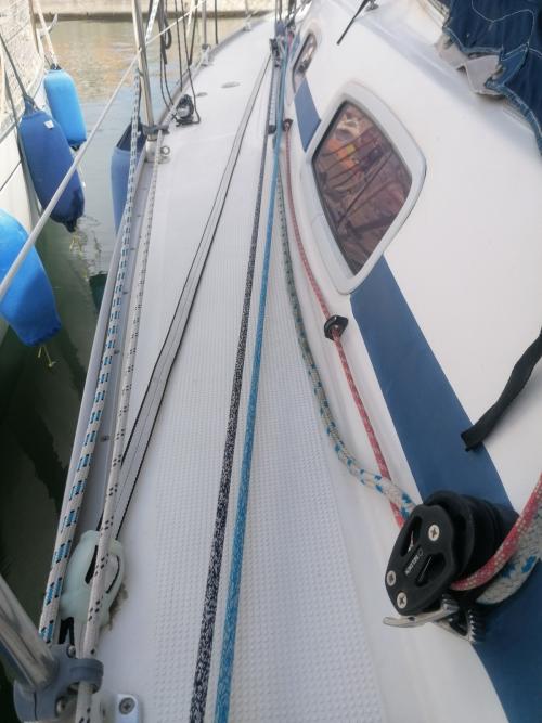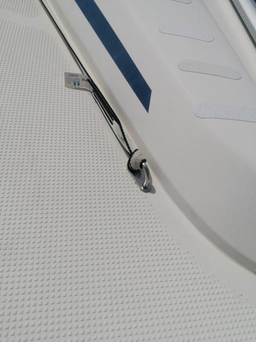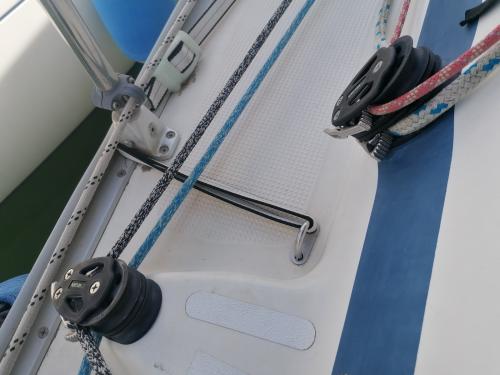 Ho due golfari in coperta all altezza dell inizio tuga verso prua e due golfari in coperta ai lati del pozzetto, più o meno dove termina lo Sprayhood. Dato però che mettendole in tensione interferivano troppo con carrelli genoa e lande, prima dei golfari poppieri ho fatto passare le fettuccie dietro alla base dell adiacente candeliere, in modo da spostare la tangenza più all' esterno. Vedo di trovare o fare delle foto.