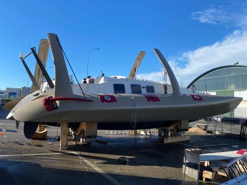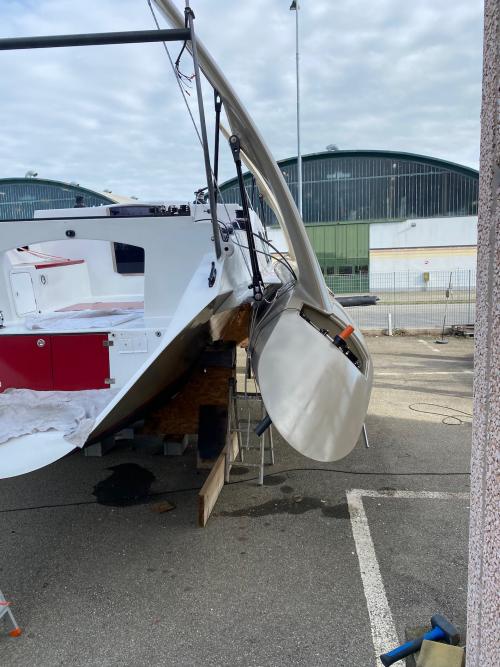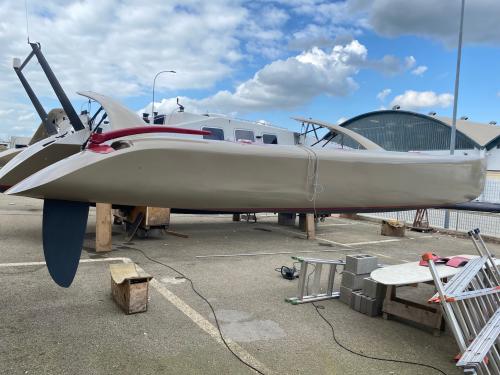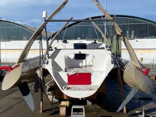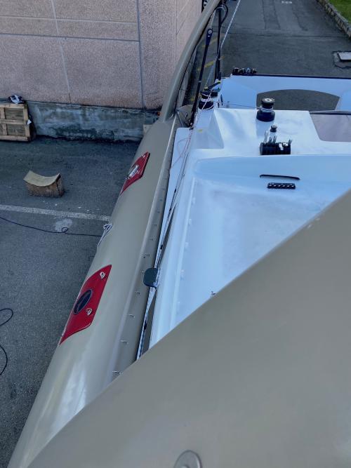arriva un problemino previsto ma difficile da valutare a priori: il fine corsa contro lo scafo centrale. La soluzione più pratica sarebbe lasciare dei parabordi sulla rete che cadendo nella chiusura li porterebbe automaticamente in posizione ma temo che la stessa rete avvolgendo il parabordo possa rovinare le superfici degli scafi. Vedrem