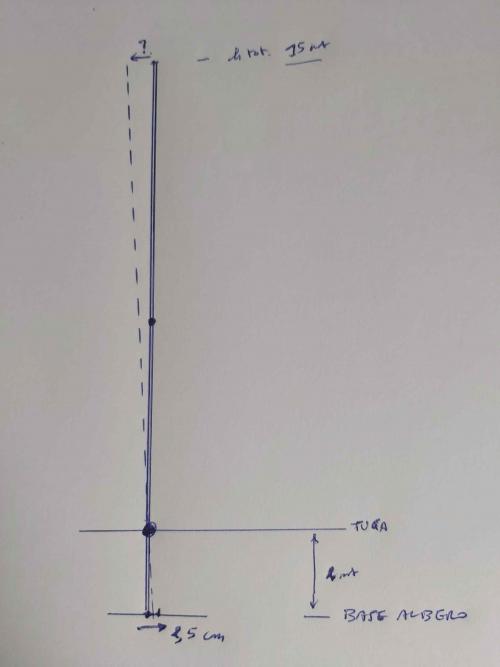 Problema di geometria pura. Vorrei avere un metodo di calcolo per stimare la variazione dell'inclinazione dell'albero a fronte dello spostamento della base di 2,5 cm Albero passante di 15 mt, ma il metodo ovviamente si applicherà a tutte le lunghezze. Come logica mi verrebbe da pensare che devo considerare la rotazione intorno al fulcro che è all'altezza della tuga.