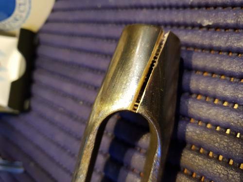 Con un po di attenzione e con il disco sottile della smerigliatrice devi tagliare nel modo che vedi in foto senza arrivare al filetto, a questo punto basta fare un po di leva nella feritoia e i due semigusci del filetto femmina si aprono. Una bella pulita e belin del filetto ed una bella ingrassata e rimetti un corpo nuovo dell'arridatoio (blue wave, stalock, ecc.) vedrai che vanno una meraviglia.