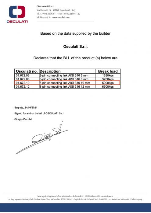 . Chi proprio vuole usare le falsemaglie, deve sforzarsi di trovarle buone, perché ogni volta che qualcuno le collauda trova notevoli differenze tra modelli che sembravano somigliarsi. Quelle di Rob (Crosby) sono sicuramente eccellenti (se ne parla bene lui, c'è sempre un buon motivo). E le trovate anche in acciaio zincato, per chi non vuole mischiare metalli. Ci sono due problemi pratici: 1) Non si trovano facilmente in UE. Io le procurai grazie a un amico che tornava dagli USA (e costavano pure poco). 2) Occhio alla misura. Sulla 10mm non ci sono problemi. Invece la 8mm (5/16") non entra nella catena da 8mm europea; è strano ma è così. Se invece restate sul catalogo Osculati, è risaputo che c'è una differenza notevolissima tra quella da 3 euro (in "Inox" non specificato) e quella da 10 euro (che ha 8 perni ed è AISI 316). Il fatto che anche quella da 3 euro resista saldamente in catalogo fa riflettere.