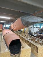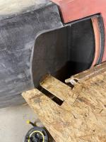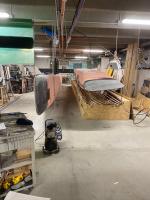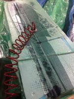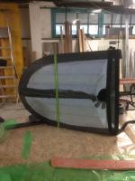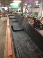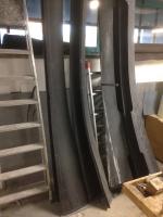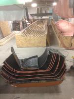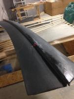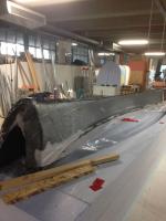 Il semiguscio laminato con l'infusione vuoi per l'inesperienza (era la prima volta) o per l'agitazione o anche perché forse da solo le cose sono più difficili è stato un disastro: pur che la resina si è distribuita abbastanza bene al limite con qualche ristagno, non ha catalizzato in alcune parti, il problema è nato perché in qualche bidone devo aver sbagliato il dosaggio (l'agitazione, tipo 300gr invece di 3000) e ha catalizzato a chiazze, poi il sacco non era ben distribuito ed in certe zone non aderiva. Messo in giardino sotto un telo in attesa di decisioni in merito una sburianata di mezza estate lo ha materialmente fatto volare di una ventina di m accartocciandolo sul tronco di un albero. Quindi fatto a fette come da foto. Quindi affrontate le travi in stampo sempre di polistirene, con accorgimenti vari infuse 10 pelli da 300gr, venute una meraviglia (8 semigusci non si finiva mai)