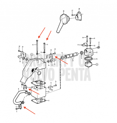 Venendo al riser, purtroppo non so come aiutarti, perché il mio è montato direttamente sul blocco motore senza il collettore n. 29. Non so se questo pezzo serve a distanziare nel caso di particolari allestimenti, oppure se è previsto solo per il modello raffreddato ad acqua dolce, ma nel mio caso non c'è.