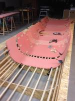 Dopo qualche striscia spaccata ci ho preso un pò la mano e la parte prodiera è quasi fatta anche se i dubbi iniziali restano tutti Sostanzialmente l'ho fatto aderire ai listelli avvitando dei pezzetti di legno tipo rondella ed ho constatato che ogni foro che si fa è l'innesco di una possibile spaccatura, inoltre pur riscaldandolo a lungo il materiale mantiene un notevole ritorno elastico. Prevedo quindi un bel problema quando dovrò togliere i pezzetti di legno per laminare la pelle interna pur considerando i graditi suggerimenti relativi alla colla poliuretanica nei giunti e la colla a caldo per fissare il pannello ai listelli dall'interno che sperimenterò senz'altro. d'altronde il metodo Farrier delle viti dall'esterno in questo caso lo trovo inapplicabile proprio per le tensioni che ad ogni buco in più fanno spaccare la lastra un bel dilemma