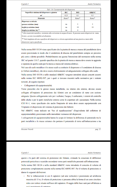 (14-05-2019, 15:30)danielef Ha scritto: Certamente IanSolo lo sapeva già ma ho scoperto due minuti fa che esiste il documento dell'International Organization for Standardization (ISO): Non il testo originale, ma tre copie schermo di uno studio che compara i vari standard (ISO, ABYC, IEC) sulla protezione delle barche, si ricostruisce bene cosa dicano. In particolare, l'ISO non dice niente sull'orientamento del conduttore verticale, per l'American boat yacht council invece non deve fare sterzate a 90° e non deve correre parallelo all'acqua, mi sembrava di ricordare era probabilmente da qui lo scetticismo con le catene. (preso da un documento che molto probabilmente era stato indicato qui su adv, senz'altro vari anni fa) [hide][Immagine: .][/hide] [hide][Immagine: .][/hide] [hide][Immagine: .][/hide]