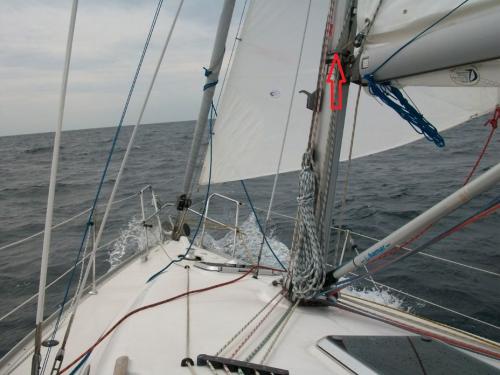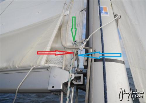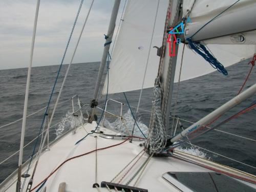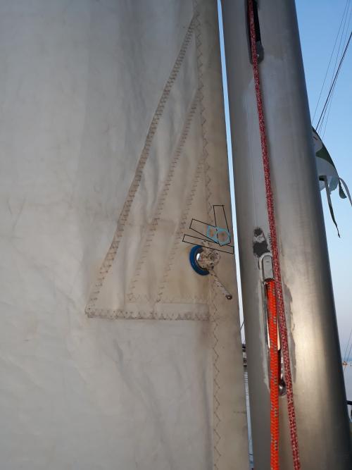 Da cui la mia ipotesi di cucire tre fettucce per obligare il bozzello nella corretta posizione, che per me, dovrebbe essere leggermente inclinata verso prua, ma non come da esempio di foto!