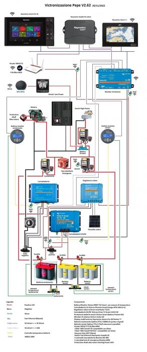 Mi sono scassato un ginocchio saltando su una barca dalla Imarroncinichegalleggiano.... e quindi ho un po' di tempo per pubblicare l'ultimo aggiornamento del mio sistema batterie. Rispetto alla versione precedente, lo schema é piú rispondente a quanto effettivamente installato sul Pepe; per semplicitá avevo disegnato degli staccabatterie "normali" ma effettivamente ho sempre avuto dei solenoidi BlueSea per batterie servizi, motore e carichi pesanti (salpa e inverter Marinco da 1000W, non ancora inserito nello schema perché verrá presto sostituito da un Victron, sa va sans dire 32). Una novitá peró c'é: dato il rincoglionimento senile ormai avanzato, piú di una volta ho lasciato la barca con i servizi accesi, ho quindi messo l'ennesimo relé WiFi Sonoff che mi permette in remoto, utilizzando Alexa, di inviare un impulso che mette il relativo solenoide in posizione off. Ho l'impressione che questo sará l'ultimo schema che pubblico con le batterie servizi al piombo, sono in arrivo importanti . le vedremo a tempo debito.Smiley44