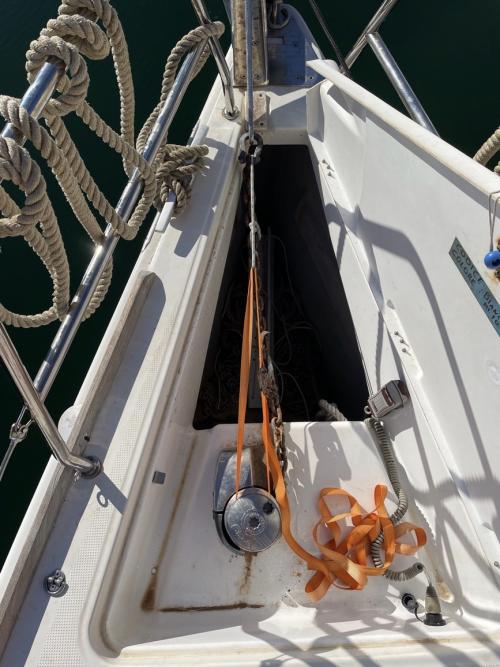 Fatti un penzolo in dyneema da abbozzare alla catena ed una o due cime da 22mm lunghe 12 mt per scaricare il salpa e elasticizzare la linea se occorre. Più vento più fili cima.