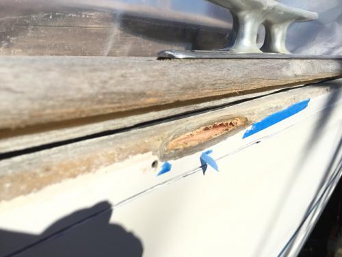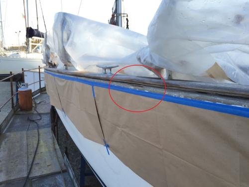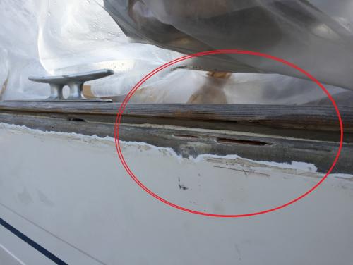 Quando il cantiere in fase di resinatura dello scafo ha rigirato sul listello di legno il tessuto non lo ha schiacciato bene lasciando il canale nella curva del tessuto. Stessa cosa hanno fatto sotto il listello con il suo belin di rinforzo.