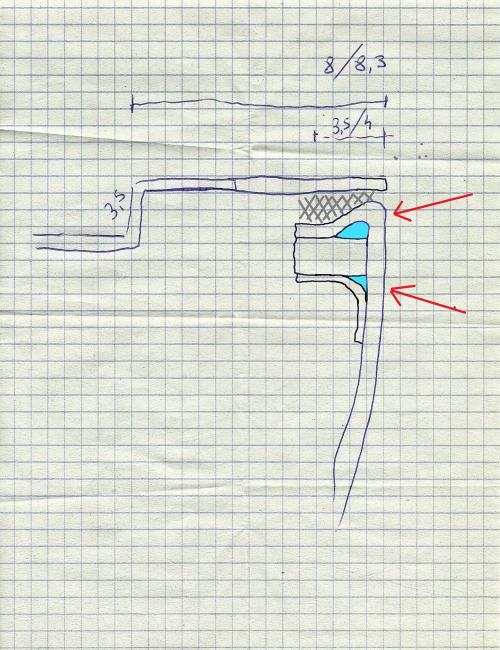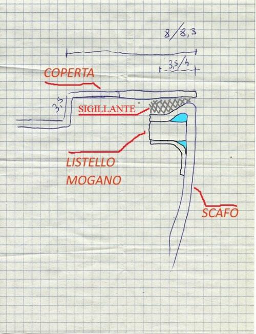la foto di seguito rappresenta un tratto di sezione disegnato a mano e che evidenzia il particolare della giunta scafo/coperta con anche il listello di legno messo dal cantiere a rinforzo. Quelli colorati in celeste sono i canaletti di cui parlavo.