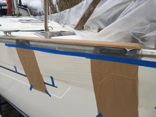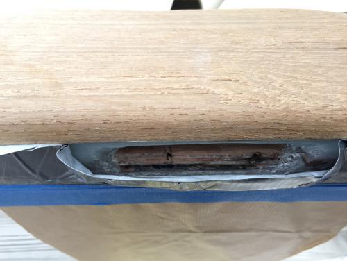 poi fresato con una fresa da 5mm il vecchio sigillante tra scafo e coperta per creare una nuova base per il nuovo sigillante e applicato kent assembly adhesive rasato a spatola, avendo cura di appllicare nastro sopra coperta e sotto, sotto aggiungendo del nasto con carta da pittore per raccogliere eventuali sgocciolature ed evitare che vada sullo scafo.
