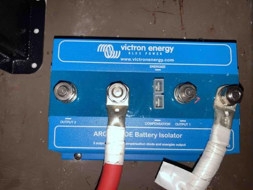 Sul cablaggio: il ripartitore in foto dovrebbe avere tre fili - uno che arriva dall'alternatore, uno che va verso le batterie servizi e uno che va alla batteria motore. Io ne vedo solo 2.