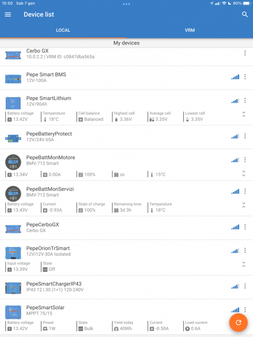 Ringrazio Maema per i suggerimenti per l’uso della build large del Venus ed AndreaB72 per la precisazione, sono stato impreciso sulla funzione del bms che non è di misurare la Soc della batterie ma di sorvegliare che il voltaggio delle singole celle rimanga nei limiti di sicurezza. Detto questo, non posso usare il Cerbo per gestire la connessione/disconnessione del carico o dei caricatori perché, nei giorni in cui il sole non riesce a dare il suo contributo, lo spengo per diminuire il consumo che sommato a quello del router Fritz 6850 e di tutti gli switch Wi-Fi Sonoff non è indifferente. Ho un pannello solare da 100W rigido ma in quei giorni non riesce a riportare le batterie servizi al 100%.