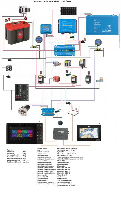 al di la' delle configurazioni per interrompere scarica/carica (interessantissime e che riesco poco a seguire non conoscendo bene quel mondo Victron), volevo capire se con l'introduzione del litio prevedi anche di fare spostamenti all'interno del tuo schema impianto attuale. Mi spiego meglio : parlando del servizio del salpa che e' un servizio HighPower e adesso lo hai sul BS, prevedendo di dover "limitare" la ricarica da alternatore (che tu lo faccia tramite il fusibile sul BMS CL come mi par di capire o altro modo mi pare che la limitazione da alternatore sia SEMPRE necessaria con LFP) ... lo lascerai ancora sulla BS che necessariamente (e a differenza del passato) dovrà' attingere alle proprie risorse perche' non potrà' utilizzare (se non parzialmente) le risorse on-the-fly dell'alternatore ? Oppure (p.e.) lo sposterai sulla BM (lasciando la optima RT DC 4.2 o magari prendendo una delle tue deep-cycle YT 5.5 che ha anche spunto superiore [1125 contro 1000 in MCA] ma invece la batteria e' piu' tosta per "quel" servizio) ? (io ho la BT 4.2 [idem YT 4.2 con spunto leggermente inferiore sia alla RT 4.2 che alla YT 5.5] ma sempre tosta e piu' adatta ad un eventuale scarica profonda [mai da auspicare per la BM]). Anticipo subito che chiedo questo senza voler, per carità', entrare nella diatriba se il salpa sia meglio sul BS o BM (che ognuno ha la propria idea ed esula da questo 3D [prego astenersi qui da opinioni BM/BS che la cosa interessante e' invece lo schema risultante dovuto ad introduzione LFP] ).
