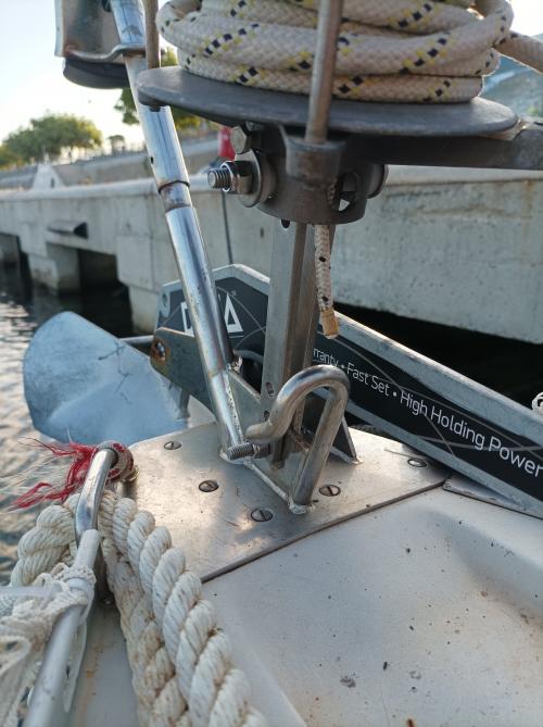Visto che siamo al punto, la posizione dell'albero va controllata per l'equilibrio e per evitare carichi anomali. Il tuo ha mi pare due sartie basse, che sono responsabili delle flessioni, la questione strallo: misura il rake, come ti ho detto, da qui decidi se lo strallo necessita di arridatoio ma probabilmente no, anche se all'epoca qualcuno li metteva, al caso potresti usare una landina forata per piccolo allungamenti. Piuttosto avrei cura di verificare l'integrità del cavo e del terminale.