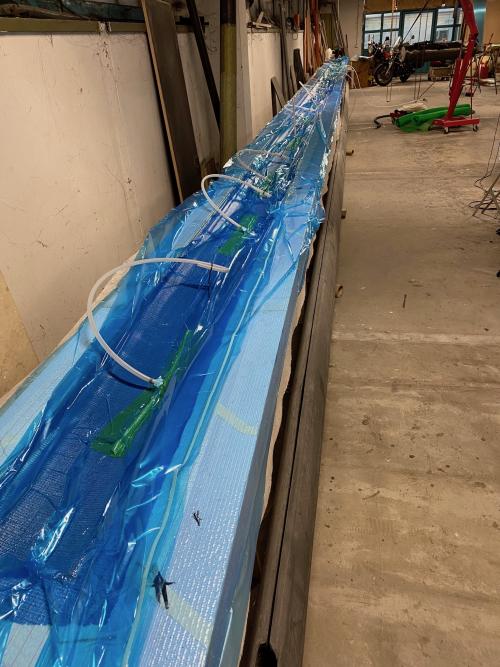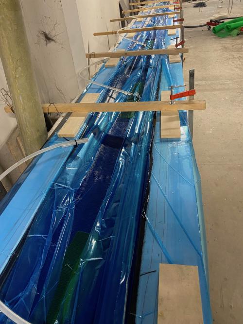 I carter forse li ho chiamati nel modo sbagliato in realtà sono stampati (uno dei primi lavori) in infusione, 10 biassiali da 300 gr/mq e una volta uniti all'anima centrale vorrei stratificare all'esterno (10 cm centrali sopra e sotto) altri 3 unidirezionali da 1000 intercalati con tessuto da 200 (quello ho). Alla fine dovrebbe fare uno spessore di 5/6 mm nella sezione di maggior sforzo