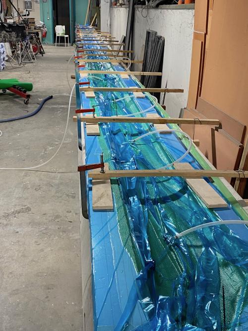 Dopo aver laminato la faccia superiore delle travi passo a laminare la faccia inferiore, sempre tre pelli da mille in infusione obbligatorio lavorare in appoggio al piano (non sottosopra)