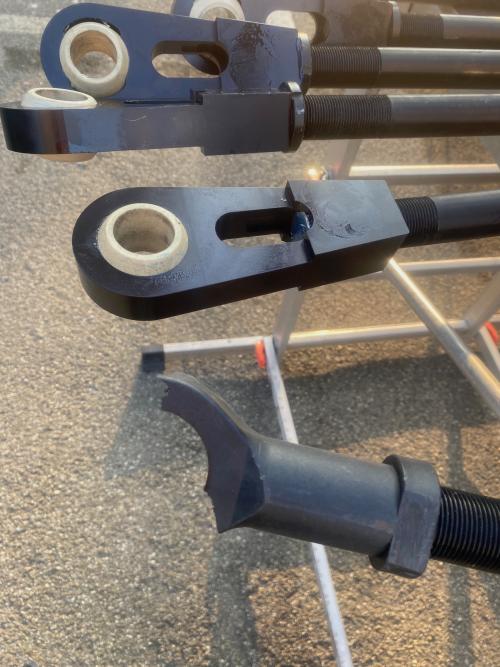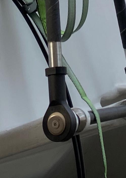 Inizialmente per ragioni di economicità, peso e semplicità per il collegamento mi sono affidato a degli uniball commerciali ø 30 in plastica (carico a trazione 10000 N) e ho realizzato i bracci avvolgendo dei tubi di pvc ø20 con del carbonio fino a ø30 confidando di poterli filettare alle due estremità M30x2 per fissare e regolare gli uniball.