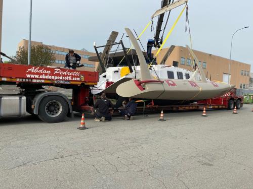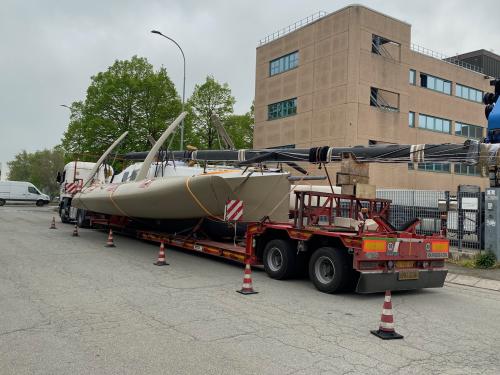 allora gente, ci siamo, siamo in acqua finalmente. Vi giro qualche foto, i filmati non riesco propio Sollevamento e pesata (nella più rosea delle previsioni letti 2780 kg che sommati con i 180 dell'albero e boma fanno 2960) con tutto quel che serve (zattera, ancora e catena, cuscineria, dotazioni sicurezza varie etc). Arrotondiamo a 3 ton, rispetto alle 4 di progetto (era in vetro) un bel successo. Quindi sorvolo della recinzione e carico sul carrello in strada